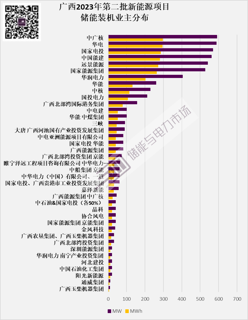 另外,5月12日,廣西發(fā)改委也印發(fā)了2023年第一批新能源項目建設(shè)方案的通知,廣西列入2023年第一批新能源項目建設(shè)方案的項目共32個,裝機(jī)容量合計400.5萬千瓦。其中,陸上風(fēng)電項目28個,裝機(jī)容量360.5萬千瓦,集中式光伏發(fā)電項目4個,裝機(jī)容量40萬千瓦。光伏們統(tǒng)計業(yè)主發(fā)現(xiàn),大唐桂冠電力拿到了100萬千瓦的指標(biāo),其中風(fēng)電60萬千瓦、光伏40萬千瓦;廣西投資集團(tuán)風(fēng)電99萬千瓦、中石油風(fēng)電72萬千瓦、廣西北部灣國際港務(wù)集團(tuán)風(fēng)電55萬千瓦、國家電投風(fēng)電31萬千瓦。經(jīng)過光伏們計算,第一批配儲能規(guī)模為1.522GWh。