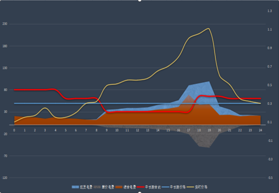 如圖3所示,在部分時(shí)間內(nèi),阻塞斷面內(nèi)的電源在承受較低現(xiàn)貨價(jià)格的同時(shí),還要向參考結(jié)算點(diǎn)價(jià)格高于合同價(jià)的用戶(hù)支付價(jià)差電費(fèi),極端情況下,電源現(xiàn)貨電費(fèi)(藍(lán)色面積)甚至小于價(jià)差電費(fèi)(灰色面積),最終形成了負(fù)結(jié)算電費(fèi)(紅色面積),當(dāng)然這種情況在大烏海區(qū)域出現(xiàn)的不多,更多的表現(xiàn)為收入降低
