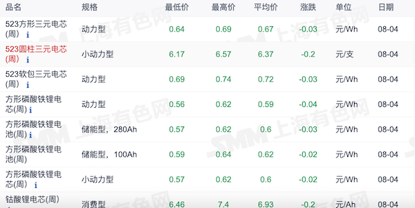 根據(jù)上海有色網(wǎng)(SMM)數(shù)據(jù),8月4日,方形磷酸鐵鋰電芯(動(dòng)力型)的報(bào)價(jià)在0.56元/Wh~0.62元/Wh,均價(jià)在0.59元/Wh;523方形三元電芯的報(bào)價(jià)在0.64元/Wh~0.69元/Wh,均價(jià)在0.67元/Wh。