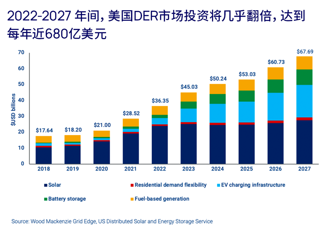 伍德麥肯茲預測,2022-2027 年間,美國DER市場投資將幾乎翻倍,達到每年近680億美元。同期內(nèi),工商業(yè)及戶用端的裝機容量將比前五年增長3.7倍,電動汽車充電設施將占據(jù)最大份額。分布式儲能容量在未來五年內(nèi)的增長將是過去五年的七倍。