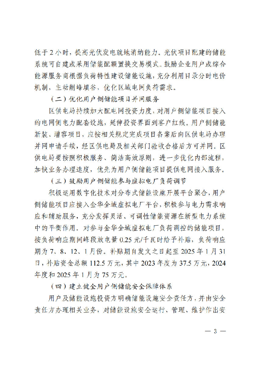對(duì)參與金華全域虛擬電廠負(fù)荷調(diào)控的儲(chǔ)能項(xiàng)目,按負(fù)荷響應(yīng)期間峰段放電量0.25元/千瓦時(shí)給予補(bǔ)貼,負(fù)荷響應(yīng)期為7、8、12、1月份。補(bǔ)貼期自發(fā)文之日起至2025年1月31日,補(bǔ)貼資金總額112.5萬元,其中2023年度為37.5萬元,2024年度和2025年1月為75萬元。