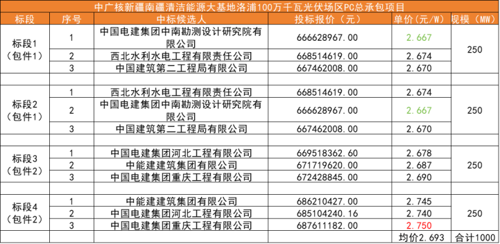 根據(jù)中標(biāo)公告,中標(biāo)價(jià)格在2.667元/W~2.75元/W之間,均價(jià)在2.693元/W;中標(biāo)候選人有中國電建集團(tuán)中南勘測設(shè)計(jì)研究院有限公司、西北水利水電工程有限責(zé)任公司、中國建筑第二工程局有限公司、中國電建集團(tuán)河北工程有限公司、中能建建筑集團(tuán)有限公司以及中國電建集團(tuán)重慶工程有限公司。各標(biāo)段中標(biāo)情況如下: