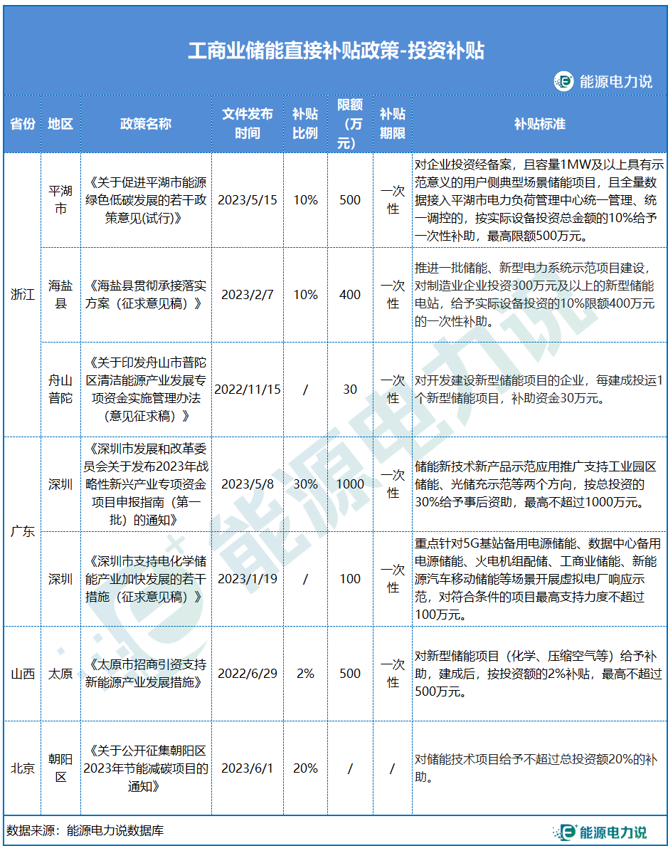 在投資補(bǔ)貼方面,今年浙江、廣東、北京等多省地區(qū)出臺(tái)了儲(chǔ)能投資補(bǔ)貼政策,投資補(bǔ)貼比例在2%-20%之間,單個(gè)項(xiàng)目補(bǔ)貼限額在30-1000萬元之間,補(bǔ)貼期限多為一次性補(bǔ)貼。其中今年5月深圳發(fā)布的《深圳市發(fā)展和改革委員會(huì)關(guān)于發(fā)布2023年戰(zhàn)略性新興產(chǎn)業(yè)專項(xiàng)資金項(xiàng)目申報(bào)指南(第一批)的通知》中補(bǔ)貼力度一騎絕塵,提出儲(chǔ)能新技術(shù)新產(chǎn)品示范應(yīng)用推廣支持工業(yè)園區(qū)儲(chǔ)能、光儲(chǔ)充示范等兩個(gè)方向,按總投資的30%給予事后資助,最高補(bǔ)貼1000萬元。