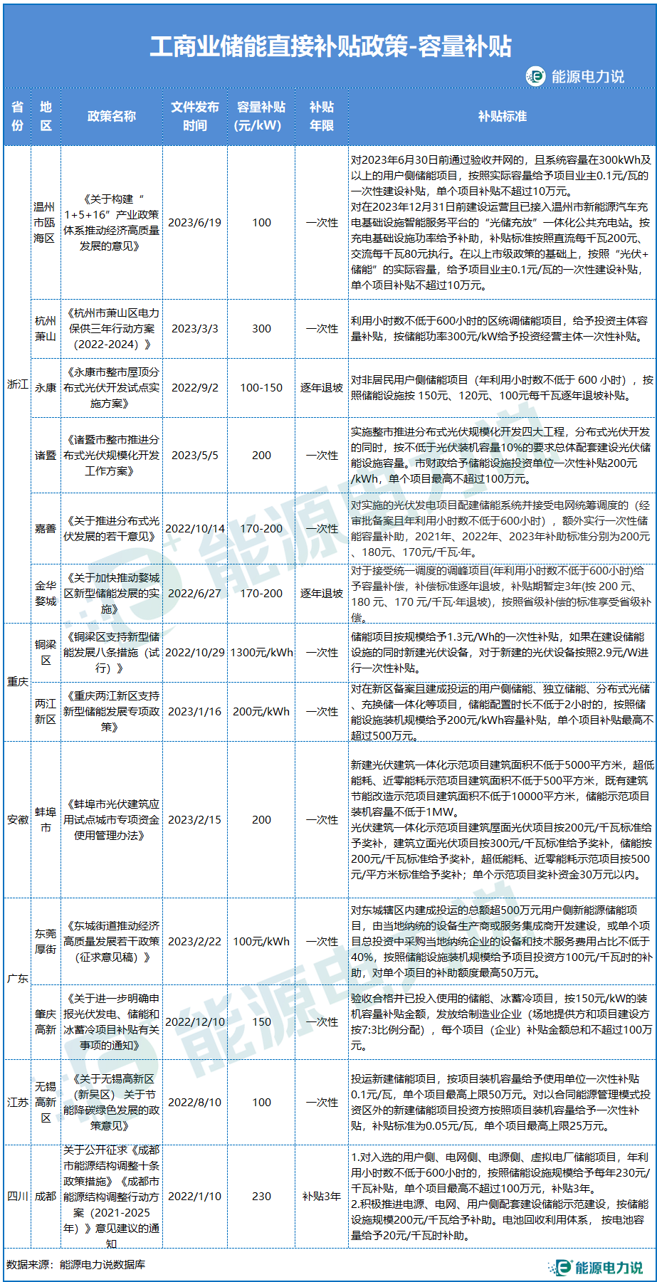 2022年至今,浙江、廣東、江蘇、重慶、安徽、天津等多個(gè)地區(qū)陸續(xù)工商業(yè)儲(chǔ)能直接補(bǔ)貼政策。對(duì)工商業(yè)儲(chǔ)能給予直接補(bǔ)貼政策,也成為一些地方政府爭取項(xiàng)目投資、產(chǎn)業(yè)落地的重要手段之一。
