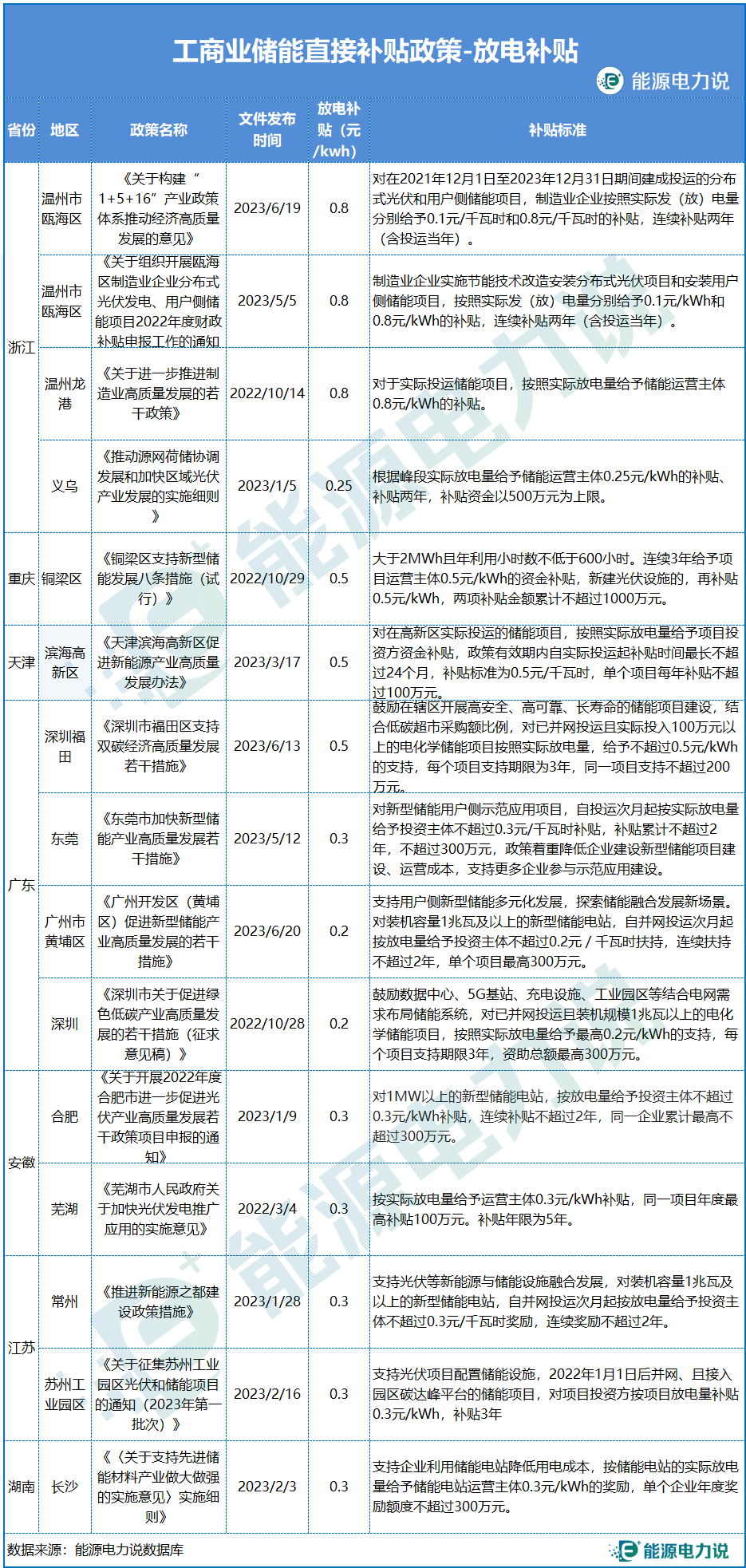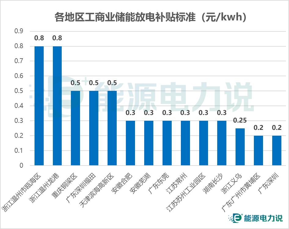 放電補(bǔ)貼方面,浙江溫州甌海區(qū)、龍港補(bǔ)貼標(biāo)準(zhǔn)最高,對(duì)投運(yùn)的儲(chǔ)能項(xiàng)目按照實(shí)際放電量給予儲(chǔ)能運(yùn)營主體0.8元/kWh的補(bǔ)貼;重慶銅梁區(qū)在補(bǔ)貼方面,對(duì)大于2MWh且年利用小時(shí)數(shù)不低于600小時(shí),連續(xù)3年給予項(xiàng)目運(yùn)營主0.5元/kWh的補(bǔ)貼;深圳福田、天津高新區(qū)濱海高新區(qū)對(duì)在區(qū)域內(nèi)投運(yùn)的項(xiàng)目,0.5元/kWh的補(bǔ)貼。