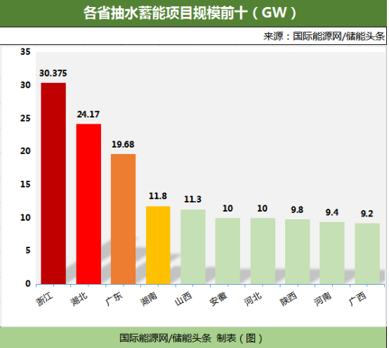 據(jù)統(tǒng)計(jì),截至目前全國(guó)已規(guī)劃了183抽水蓄能項(xiàng)目。其中73個(gè)抽水蓄能電站項(xiàng)目已開(kāi)工,裝機(jī)容量達(dá)91.38GW;110個(gè)抽水蓄能電站項(xiàng)目擬建設(shè),裝機(jī)容量達(dá)136.475GW。從項(xiàng)目所在地區(qū)來(lái)看,項(xiàng)目分布于浙江、湖北、廣東、湖南、山西、安徽、河北、陜西等26個(gè)省市,浙江以30.375GW排名第一,湖北以24.17GW排名第二,廣東以19.68GW排名第三。湖南、山西、安徽、河北、陜西、河南、廣西7省項(xiàng)目規(guī)模均超9GW。