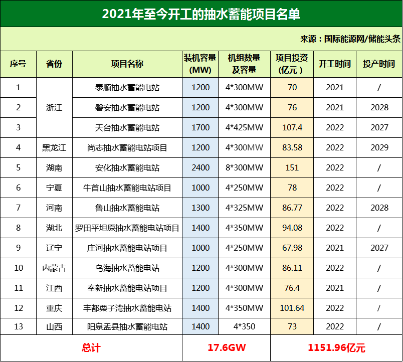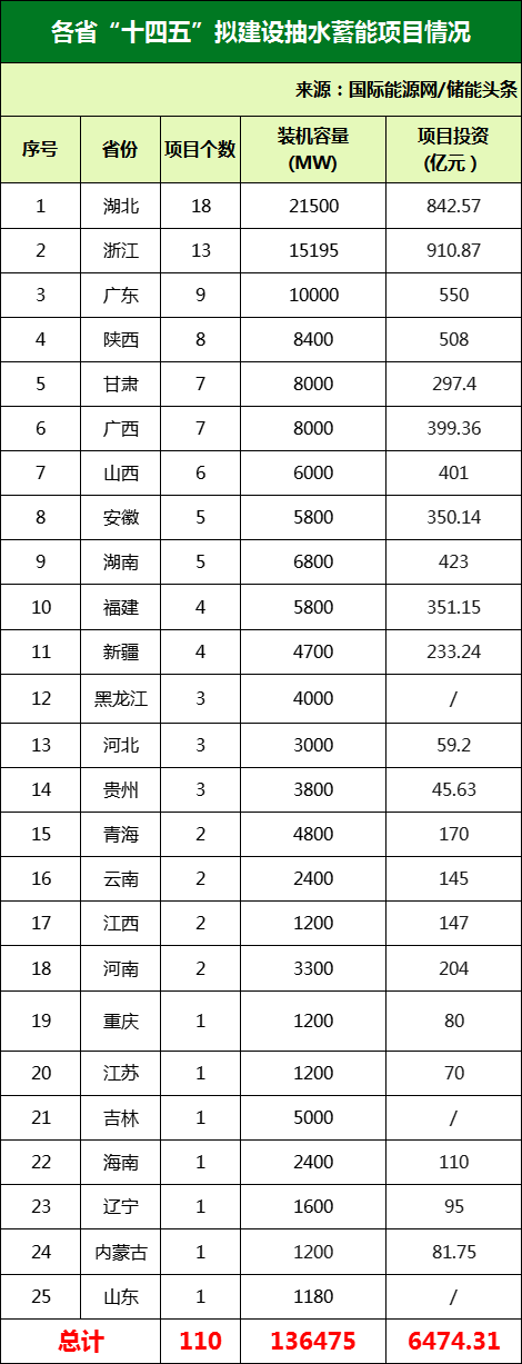 根據(jù)國(guó)家及地方“十四五”規(guī)劃公開(kāi)數(shù)據(jù),國(guó)際能源網(wǎng)統(tǒng)計(jì)了110個(gè)正在推進(jìn)的抽水蓄能項(xiàng)目,總投資超6504.31億元,容量規(guī)模達(dá)136.475GW。