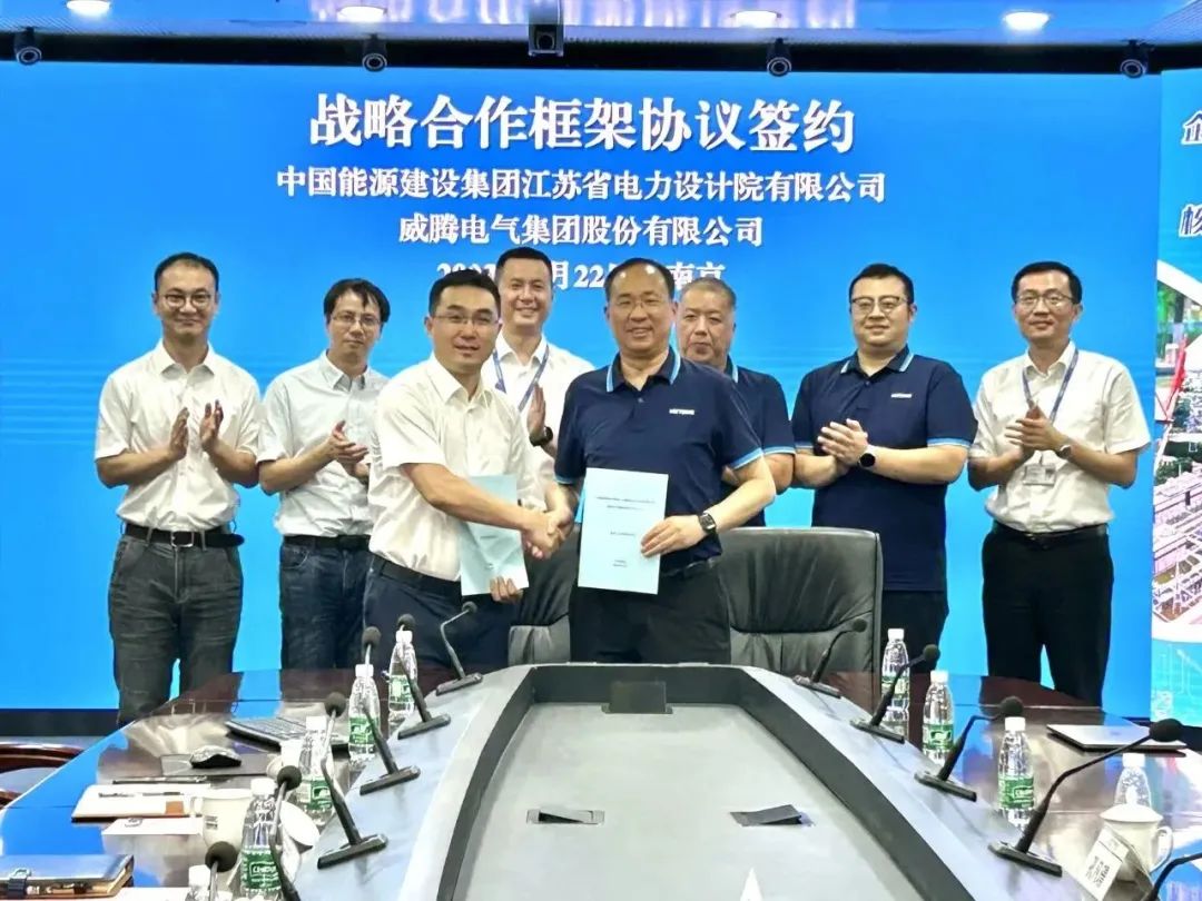 最后,雙方參會(huì)人員圍繞行業(yè)發(fā)展形勢(shì)、潛在合作領(lǐng)域等話題深度交換了意見(jiàn)。在全體參會(huì)人員的見(jiàn)證下,江蘇院副總經(jīng)理吳剛、威騰電氣董事長(zhǎng)蔣文功代表雙方簽署了戰(zhàn)略合作框架協(xié)議。