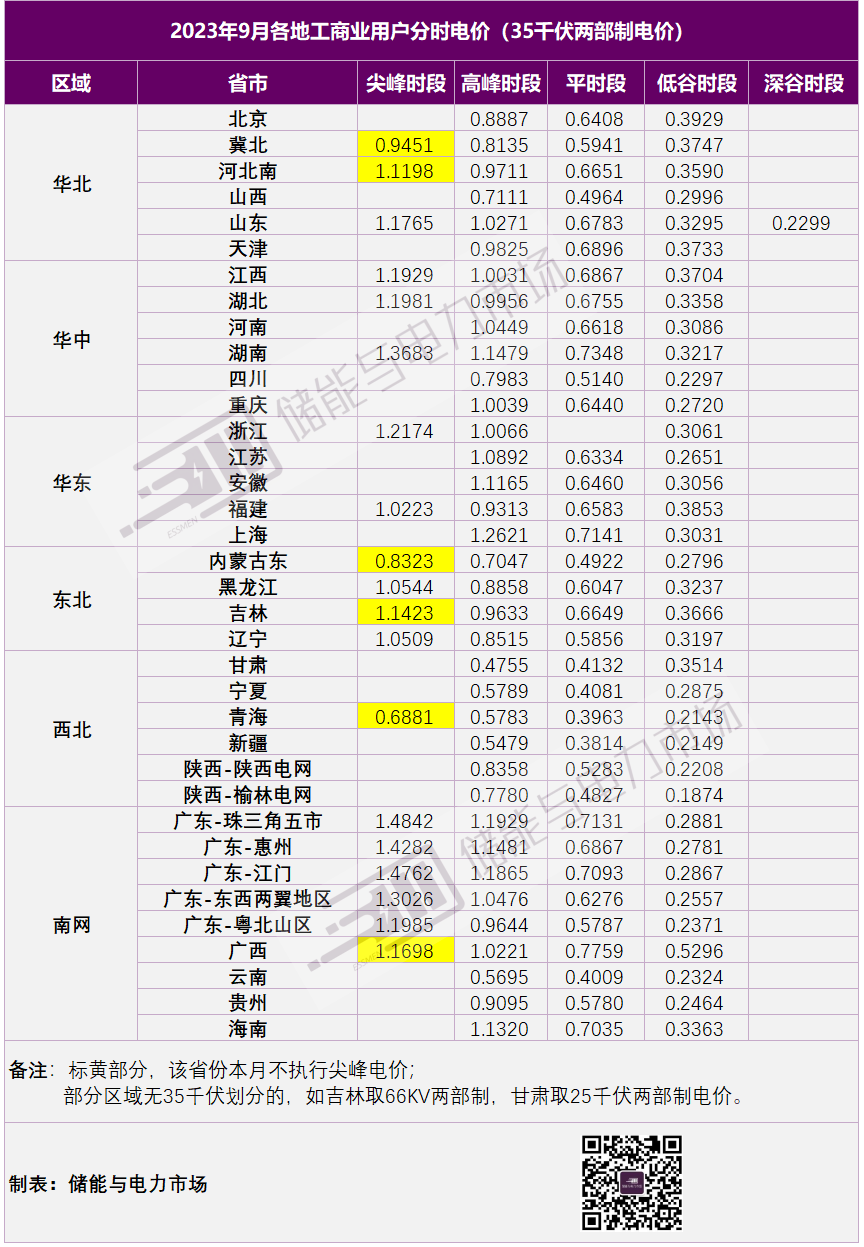 各區(qū)域2023年9月工商業(yè)用戶電價如下所示。