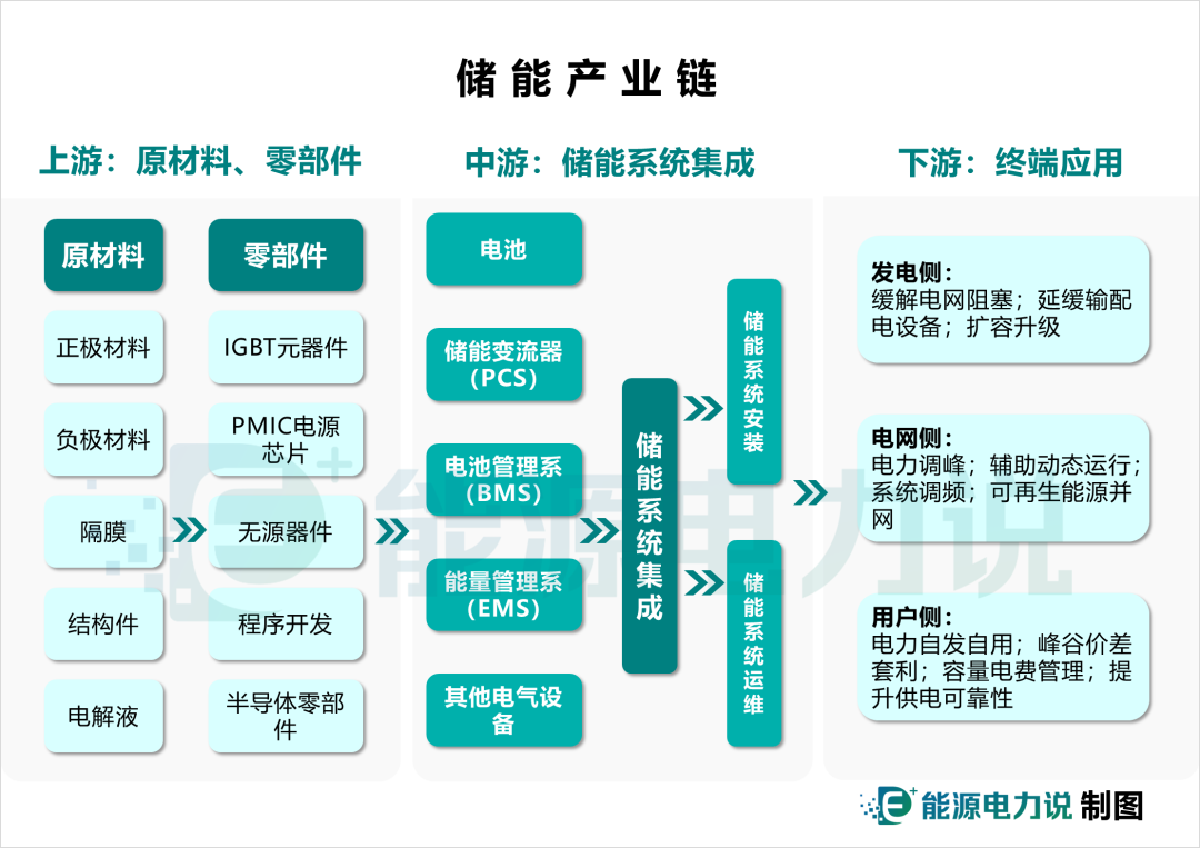 中國儲能網(wǎng)訊:從電化學(xué)儲能系統(tǒng)產(chǎn)業(yè)鏈來看,上游是電池原材料、電子元器件供應(yīng)商等;中游是儲能系統(tǒng)集成;下游應(yīng)用端則是風(fēng)光電站、電網(wǎng)系統(tǒng)、戶用/工商業(yè)、通信運營商、數(shù)據(jù)中心等終端用戶。一個典型的電化學(xué)儲能系統(tǒng)主要由電池、儲能變流器(PCS)、電池管理系統(tǒng)(BMS)、能量管理系統(tǒng)(EMS)四個核心部分構(gòu)成。