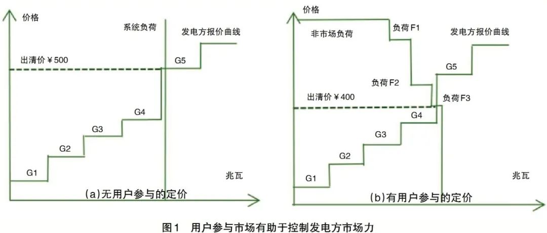 二是有助于控制發(fā)電方的市場(chǎng)力,降低用戶購(gòu)電成本。當(dāng)發(fā)電方要價(jià)過(guò)高時(shí),部分用戶可以降低負(fù)荷需求,平衡供需關(guān)系。如圖(a)所示,如果市場(chǎng)競(jìng)爭(zhēng)中沒(méi)有用戶直接參與,系統(tǒng)的需求曲線就是一條豎直的直線,市場(chǎng)出清價(jià)則由報(bào)價(jià)最高的邊際發(fā)電機(jī)組設(shè)定,邊際機(jī)組G5可以通過(guò)提高報(bào)價(jià)來(lái)提高市場(chǎng)出清價(jià),用戶只能作為價(jià)格接受者被動(dòng)接受市場(chǎng)價(jià)格,無(wú)法體現(xiàn)出用戶的交易意愿。但是如果用戶報(bào)價(jià)可以參與市場(chǎng)出清,如圖(b)所示,原來(lái)的邊際機(jī)組G5便無(wú)法中標(biāo)。市場(chǎng)出清價(jià)則由用戶F3來(lái)確定。G5如果想要中標(biāo),其報(bào)價(jià)就必須低于用戶F3。因此,因?yàn)橛杏脩鬎3的參與,G5的市場(chǎng)力得到了有效控制。