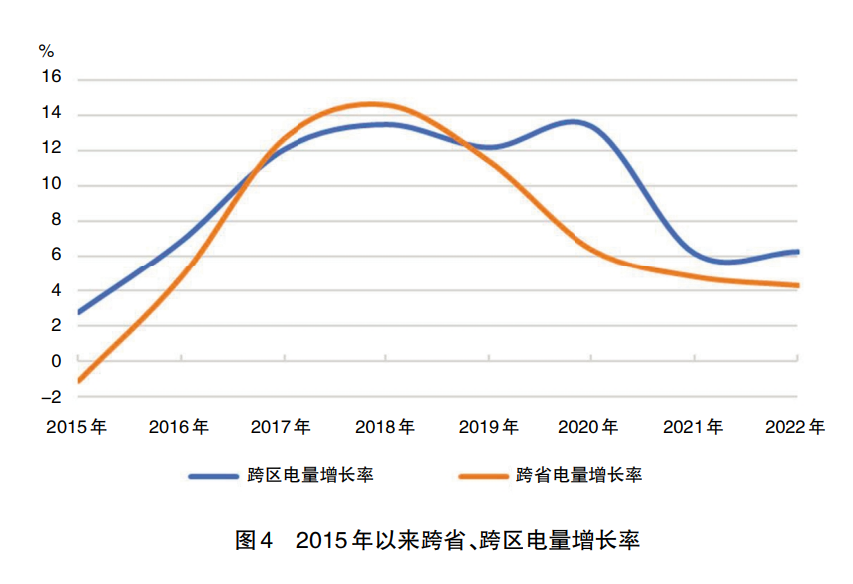 西部內(nèi)供電力需求增長。隨著高耗能產(chǎn)業(yè)西遷,西部省份的電力需求將以高于全國增速的水平快速增長,且晚于東部地區(qū)達(dá)峰,西部滿足自身用電的需求加大?!笆濉敝衅谝詠?,受東西部產(chǎn)業(yè)格局變遷、全國宏觀經(jīng)濟(jì)形勢(shì)等影響,跨省、跨區(qū)輸電量增速逐年下降,分別由2018年的14.6%和13.5%下降到2022年的4.3%和6.3%(圖4)。