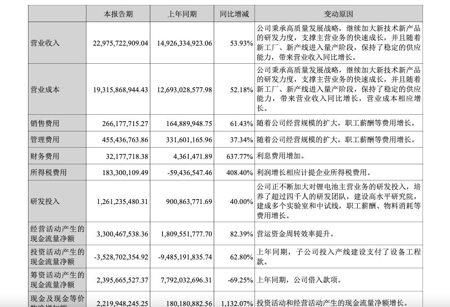 報(bào)告顯示,報(bào)告期內(nèi)實(shí)現(xiàn)營(yíng)收229.76億元,同比增長(zhǎng)53.93%;凈利潤(rùn)21.51億元,同比增長(zhǎng)58.27%。分業(yè)務(wù)看,其中動(dòng)力電池上半年實(shí)現(xiàn)營(yíng)業(yè)收入121.19億元,同比增長(zhǎng)71.92%。儲(chǔ)能電池上半年實(shí)現(xiàn)營(yíng)業(yè)收入70.72億元,同比增長(zhǎng)120.17%。