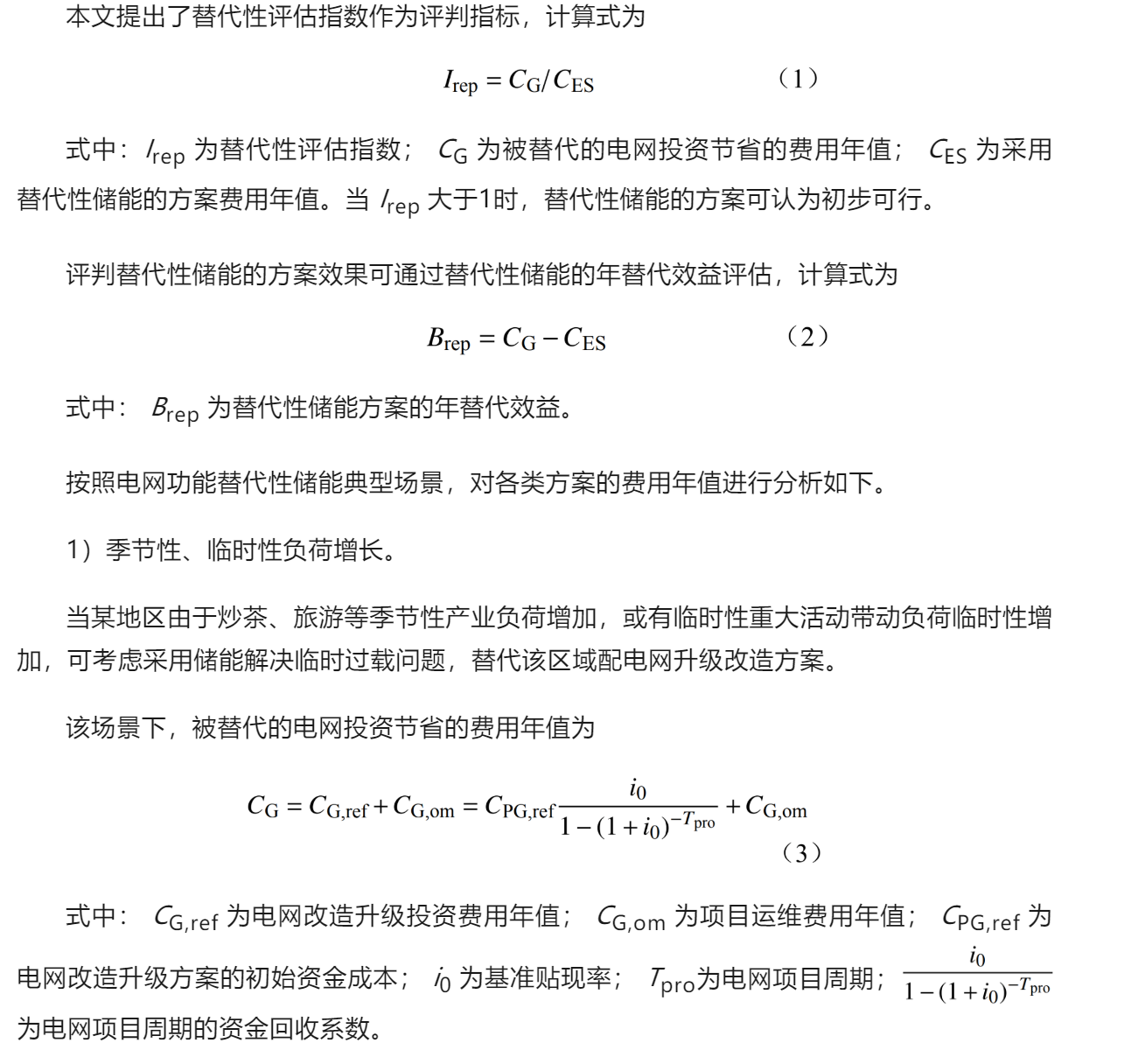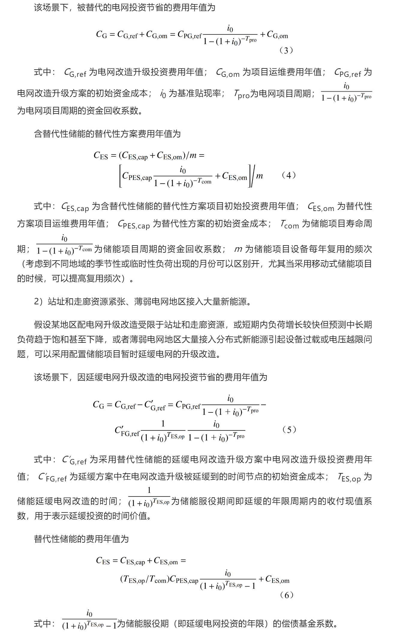 在國(guó)家政策大力支持下,中國(guó)新型儲(chǔ)能已在電力系統(tǒng)各個(gè)環(huán)節(jié)開(kāi)展應(yīng)用,部分項(xiàng)目已進(jìn)入商業(yè)化運(yùn)行階段。隨著儲(chǔ)能的技術(shù)經(jīng)濟(jì)性不斷提升,在一些應(yīng)用場(chǎng)景下儲(chǔ)能建設(shè)可達(dá)到替代電網(wǎng)輸配電設(shè)施的效果,發(fā)揮解決基本供電問(wèn)題、延緩輸變電升級(jí)改造需求、提升電網(wǎng)供電能力、提升應(yīng)急保障能力和供電可靠性等作用[1-3]。國(guó)家政策明確支持電網(wǎng)功能替代性?xún)?chǔ)能發(fā)展,提出研究探索將電網(wǎng)替代性?xún)?chǔ)能設(shè)施成本收益納入輸配電價(jià)回收[4-5]。