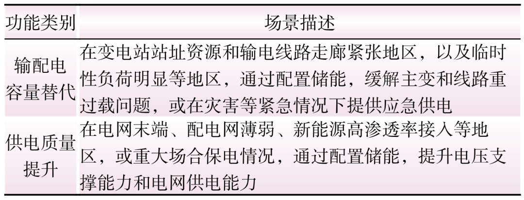 分層級(jí)梳理形成電網(wǎng)功能替代性?xún)?chǔ)能應(yīng)用場(chǎng)景,可分成輸配電容量替代和供電質(zhì)量提升兩大類(lèi),如表1所示。1)輸配電容量替代,主要指變電容量和輸配電容量的替代,解決站址和走廊資源緊張、臨時(shí)性負(fù)荷明顯災(zāi)害應(yīng)急供電等問(wèn)題;2)供電質(zhì)量提升,主要指實(shí)現(xiàn)電壓支撐和提升電網(wǎng)供電可靠性等,包括在電網(wǎng)末端、配電網(wǎng)薄弱、新能源高滲透率接入等地區(qū)或重大場(chǎng)合保電情況,通過(guò)配置儲(chǔ)能,提升電壓支撐能力和電網(wǎng)供電質(zhì)量。