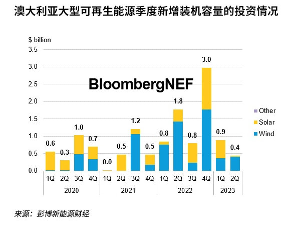 彭博新能源財(cái)經(jīng)估計(jì),2023年第二季度對(duì)大型可再生能源新增裝機(jī)容量的投資額為4.39億美元(合6.64億澳元)——在第一季度表現(xiàn)強(qiáng)勁后環(huán)比下降50.7%,同比降75.3%。