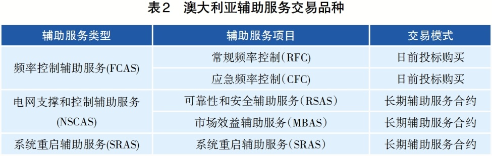 澳大利亞電力市場分為國家電力市場(NEM)和批發(fā)電力市場(WEM),除西澳大利亞州采用批發(fā)電力市場外,其他州執(zhí)行國家電力市場。2001年起,澳大利亞電力工業(yè)結(jié)構(gòu)重組并構(gòu)建統(tǒng)一電力市場體系,此時國家電力市場的輔助服務(wù)品種主要包含頻率控制輔助服務(wù)(FCAS)。2009年,澳大利亞重新建立電力監(jiān)管體系,國家電力市場的輔助服務(wù)品種進(jìn)行相應(yīng)的擴(kuò)充。截至2022年,澳大利亞國家電力市場的輔助服務(wù)品種如表2所示。