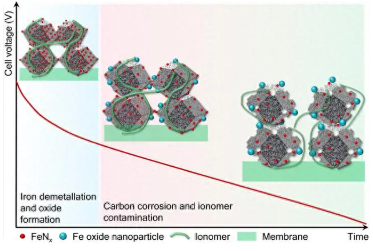 通過(guò)對(duì)電化學(xué)數(shù)據(jù)和物理表征的綜合分析,該團(tuán)隊(duì)首次揭示了 Fe-N-C 催化劑在氫燃料電池運(yùn)行中的衰退機(jī)制。