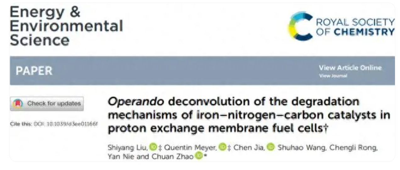 日前,相關(guān)論文以《實(shí)時(shí)解析質(zhì)子交換膜燃料電池中鐵-氮-碳催化劑降解機(jī)理》(Operando deconvolution of the degradation mechanisms of iron–nitrogen–carbon catalysts in proton exchange membrane fuel cells)為題發(fā)表在 Energy & Environmental Science[1]。