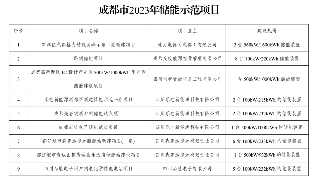 成都市2023年儲(chǔ)能示范項(xiàng)目公示
