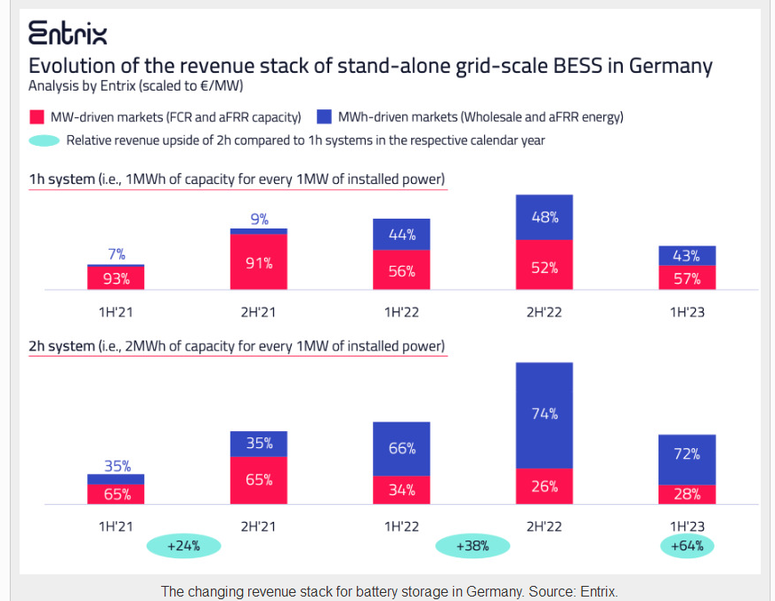 正如Entrix公司提供的圖表所示,德國運(yùn)營的兩小時電池儲能系統(tǒng)的優(yōu)勢已經(jīng)從2021年的24%大幅增長到2022年的38%。