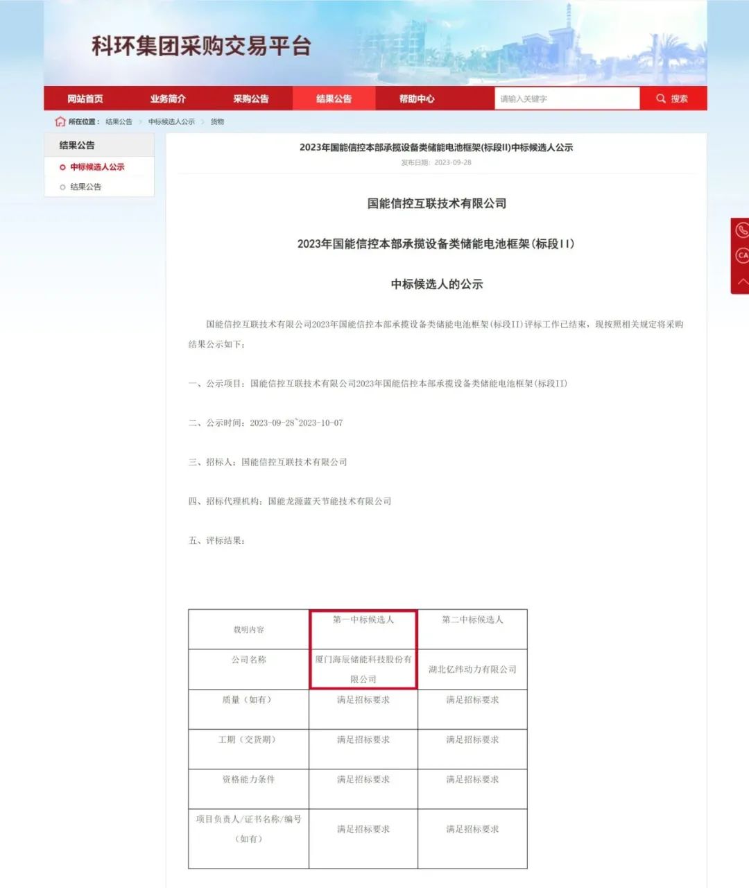 中國(guó)儲(chǔ)能網(wǎng)訊:10月8日,國(guó)能信控互聯(lián)技術(shù)有限公司2023年國(guó)能信控本部承攬?jiān)O(shè)備類儲(chǔ)能電池框架中標(biāo)候選人公示結(jié)束,海辰儲(chǔ)能預(yù)中標(biāo)2023年國(guó)能信控本部承攬?jiān)O(shè)備類儲(chǔ)能電池框架(標(biāo)段Ⅱ),容量約1GWh。據(jù)悉,該項(xiàng)目采購(gòu)總?cè)萘考s3GWh,主要用于集成風(fēng)冷、液冷高壓儲(chǔ)能系統(tǒng),開(kāi)展儲(chǔ)能項(xiàng)目建設(shè)。