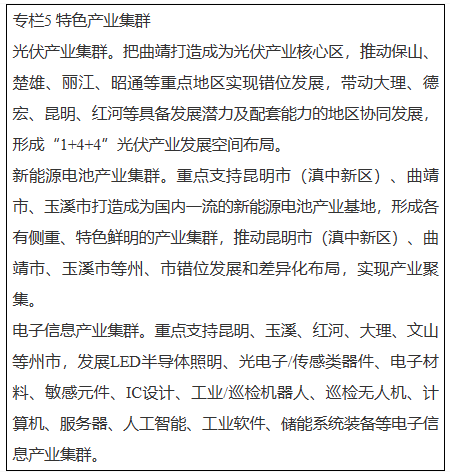 按照“優(yōu)化布局、分類集聚、錯(cuò)位發(fā)展、優(yōu)勢(shì)互補(bǔ)、突出特色”的原則,以滇中地區(qū)為核心,大理、紅河、文山、保山、德宏、麗江等州市為聯(lián)動(dòng)發(fā)展區(qū),高起點(diǎn)、高規(guī)格、高標(biāo)準(zhǔn)培育建設(shè)一批光伏、新能源電池、電子信息產(chǎn)業(yè)等特色產(chǎn)業(yè)集群、產(chǎn)業(yè)園區(qū)。