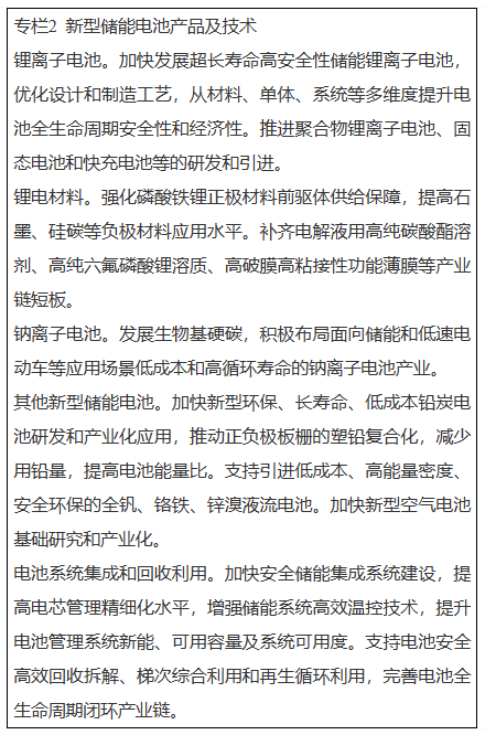 以大規(guī)模儲(chǔ)能、柔性并網(wǎng)、光儲(chǔ)一體化等新型儲(chǔ)能電池下游重點(diǎn)應(yīng)用產(chǎn)業(yè)需求為導(dǎo)向,推進(jìn)儲(chǔ)能電池產(chǎn)業(yè)發(fā)展。提高鋰、鎳、鈷、鉑、錳、生物基硬碳等產(chǎn)業(yè)資源保障能力,加快推進(jìn)符合國(guó)家標(biāo)準(zhǔn)的高性能鋰離子電池、固態(tài)電池、鈉離子電池、燃料電池等新型電池產(chǎn)業(yè)化落地。加強(qiáng)長(zhǎng)壽命高安全性電池體系、大規(guī)模大容量高效儲(chǔ)能、交通工具移動(dòng)儲(chǔ)能等關(guān)鍵技術(shù)的研究。建立完善鋰電全生命周期溯源管理體系。積極推廣基于優(yōu)勢(shì)互補(bǔ)功率型和能量型電化學(xué)儲(chǔ)能技術(shù)的混合儲(chǔ)能系統(tǒng)。