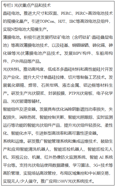 發(fā)揮我省光伏產(chǎn)業(yè)基礎(chǔ)、資源稟賦和區(qū)位優(yōu)勢(shì),重點(diǎn)發(fā)展N型高效電池和組件等產(chǎn)業(yè)鏈環(huán)節(jié),加快引進(jìn)BIPV光伏構(gòu)件、柔性薄膜電池、鈣鈦礦及疊層電池等新型光伏產(chǎn)品,提升電子漿料、光伏背板、光伏玻璃、電子化學(xué)品等關(guān)鍵光伏輔材產(chǎn)業(yè)化能力。加快智能光伏創(chuàng)新突破,鼓勵(lì)發(fā)展集電力變換、遠(yuǎn)程控制、在線分析、環(huán)境自適應(yīng)等于一體的組件、逆變器、控制系統(tǒng)、匯流箱、跟蹤系統(tǒng)、接線盒等智能型關(guān)鍵部件。鼓勵(lì)開(kāi)發(fā)安全便捷的戶用智能光伏系統(tǒng)和光伏充電寶、穿戴裝備、交通工具等移動(dòng)能源產(chǎn)品。探索建立光伏“碳足跡”評(píng)價(jià)標(biāo)準(zhǔn)并開(kāi)展認(rèn)證。加快構(gòu)建光伏供應(yīng)鏈溯源體系,推動(dòng)光伏組件回收利用技術(shù)研發(fā)及產(chǎn)業(yè)化應(yīng)用。