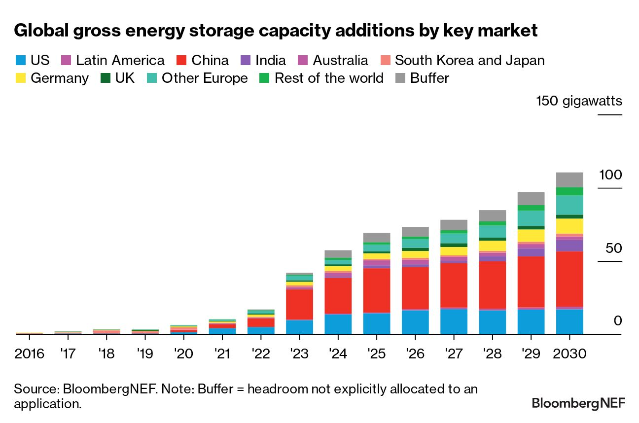 亞太地區(qū)在儲(chǔ)能裝機(jī)容量(以GW計(jì))方面保持領(lǐng)先,2030年將占新增裝機(jī)容量的近一半(47%)。中國之所以領(lǐng)先,很大程度上是因?yàn)樽陨隙聫?qiáng)制性要求大型風(fēng)電和光伏配建儲(chǔ)能。其他市場也制定了促進(jìn)儲(chǔ)能的新政策。韓國將舉行儲(chǔ)能競價(jià)以減少可再生能源棄電,并發(fā)布新政以重振其商業(yè)儲(chǔ)能行業(yè)。澳大利亞和日本都在為清潔穩(wěn)定容量進(jìn)行新的容量競價(jià),通過提供長期容量電價(jià)有利于儲(chǔ)能安裝。印度新的輔助服務(wù)產(chǎn)品可能在批發(fā)市場為固定式儲(chǔ)能提供機(jī)會(huì)。我們將2030年亞太地區(qū)累計(jì)儲(chǔ)能部署規(guī)模(以GW計(jì))的預(yù)測上調(diào)42%至39GW/105GWh,這主要是由于中國的預(yù)測前景和方法指引更新。