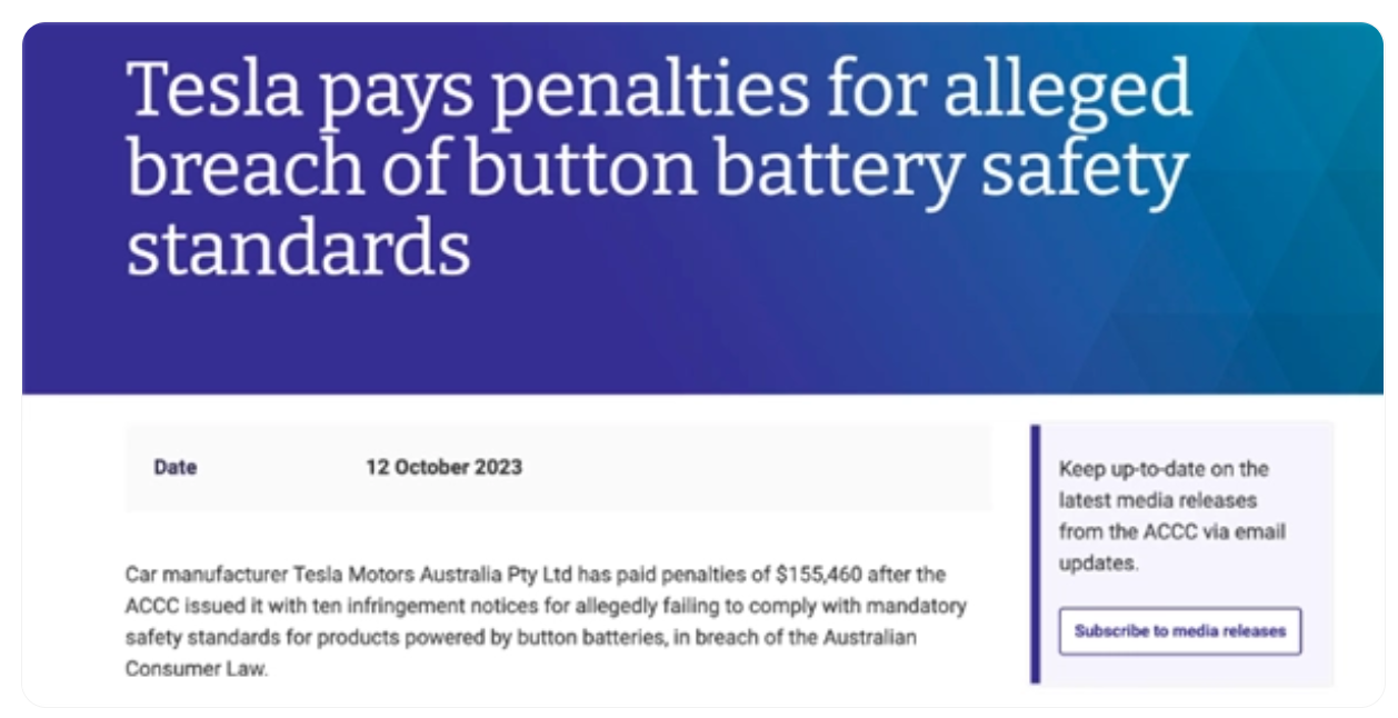 中國(guó)儲(chǔ)能網(wǎng)訊:10月12日消息,近日,據(jù)外媒報(bào)道,澳大利亞競(jìng)爭(zhēng)與消費(fèi)者委員會(huì)在其官網(wǎng)發(fā)布公告稱(chēng):特斯拉澳大利亞公司因涉嫌未能遵守紐扣電池供電產(chǎn)品的強(qiáng)制性安全標(biāo)準(zhǔn),違反了澳大利亞消費(fèi)者法。