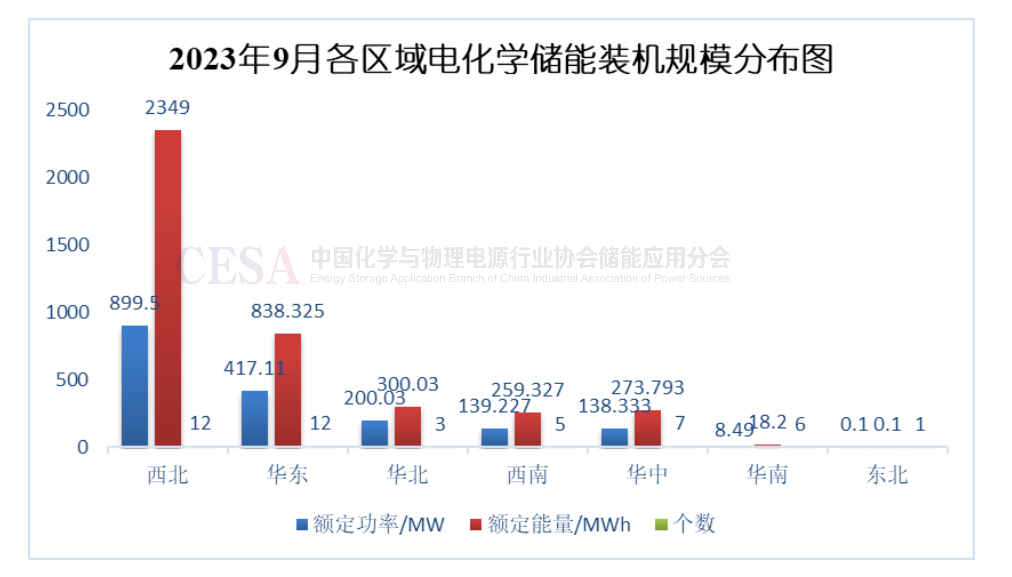 圖3 2023年8月各區(qū)域電化學(xué)儲能裝機規(guī)模分布圖