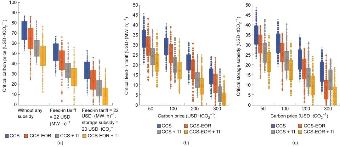圖3. 不同情景下煤電開展CCUS技術所需激勵政策的臨界值。