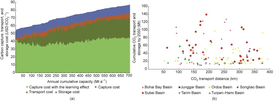 圖1. 成本效益結果、電廠匹配的埋存盆地運輸距離和2050年CO2累計埋存量。