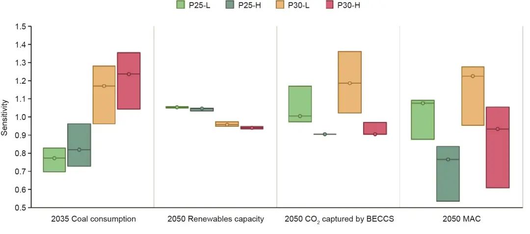 圖11. 2035年煤炭消費、2050年可再生能源裝機(jī)容量、2050年BECCS產(chǎn)生的負(fù)排放和2050年邊際減排成本的靈敏性分析。在固定峰值水平、達(dá)峰時間和2050年排放水平的情況下,2011—2050年每個靈敏性情景下累計排放增加或減少5%。根據(jù)基礎(chǔ)情景的平均值對結(jié)果進(jìn)行歸一化處理。箱型圖中的空心點代表了基礎(chǔ)情景下的數(shù)值。