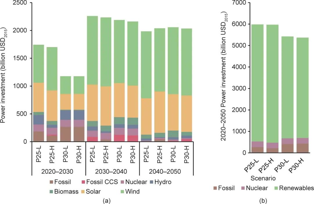 圖9. 電力部門不同技術(shù)投資(a)和2020—2050年電力部門總投資(b)。USD2015表示采用2015年美元不變價,并且按照2015年官方公布的匯率將人民幣轉(zhuǎn)換為美元進(jìn)行統(tǒng)計。
