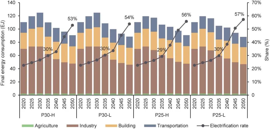 電力部門脫碳是中國能源轉(zhuǎn)型的核心,電力部門碳排放預(yù)期會在未來10年明顯下降。電力部門碳排放量是所有部門中最大的,峰值水平將低于45億噸。隨后電力部門將用大約10年的時間快速實現(xiàn)脫碳,并且在2040年左右開始產(chǎn)生負(fù)排放。2040年以后,隨著電力部門清潔轉(zhuǎn)型的完成,進(jìn)一步的減排將依賴負(fù)排放技術(shù)和需求側(cè)的深度脫碳。到2050年,在P30-L情景下,將需要近10億噸負(fù)排放,而由于2050年的碳預(yù)算相對較高(P25-H和P30-H)或者更早采取減排措施(P25-H和P25-L),其他情景的負(fù)排放需求量不超過8億噸。