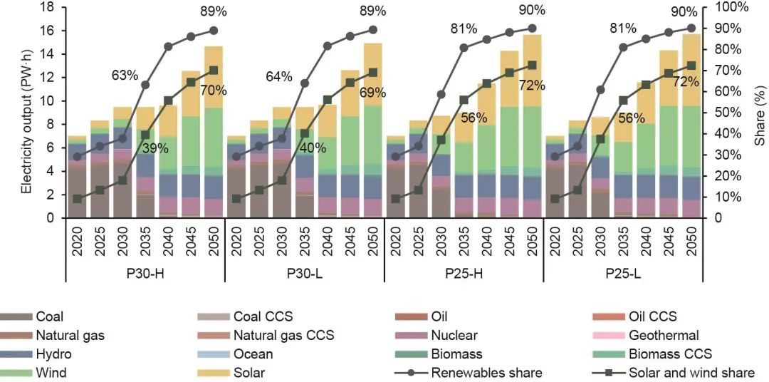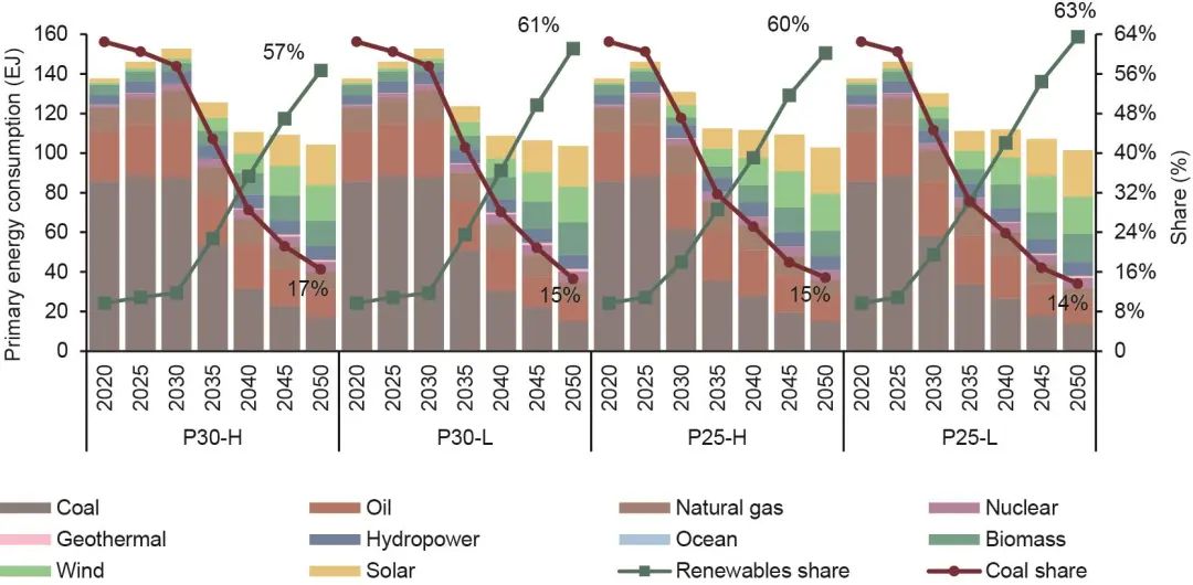 相比之下,可再生能源目前占一次能源消費的10%,同時增長緩慢,主要是為了滿足增量能源需求。未來,可再生能源將最有希望填補(bǔ)由煤炭消費下降造成的缺口,從而逐步取代化石燃料。據(jù)測算,在2035—2040年,可再生能源將超越化石燃料,成為中國最主要的能源。到2050年,中國一次能源消費中可再生能源比重將達(dá)到約60%。同樣,對于2050年碳預(yù)算較低或者開始減排較早的情景(P25-L、P25-H和P30-L),可再生能源的占比將更高。