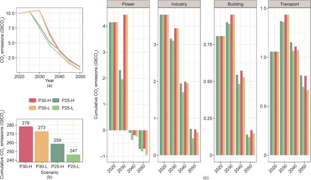 盡管BECCS技術(shù)的部署受到累計排放量變化的重大影響,但提前達(dá)峰能夠減少對碳移除技術(shù)的依賴并減少由累計排放量不確定性帶來的波動。由于所有部門在2050年都已經(jīng)深度脫碳,因此所有情景都顯示出了對BECCS的巨大需求,其中P25-L和P30-L情景有更高的普及率。與碳移除技術(shù)類似,MAC受到累計排放量的影響較大。較晚達(dá)峰和更嚴(yán)格的長期排放目標(biāo)都會增加MAC,產(chǎn)生更大的減排壓力,提前達(dá)峰能夠在實現(xiàn)長期目標(biāo)中占據(jù)主動地位。