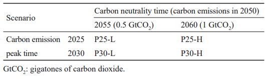 為了探討碳達(dá)峰時間和碳中和時間差異對能源系統(tǒng)轉(zhuǎn)型的影響,設(shè)計了以下4個轉(zhuǎn)型情景(表1)。