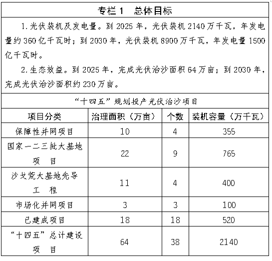 (二)總體目標。配合“三北”六期等生態(tài)治理工程,實施全區(qū)沙漠、沙地光伏治沙規(guī)?;_發(fā),助力庫布其沙漠、烏蘭布和沙漠、毛烏素沙地等重點區(qū)域得到系統(tǒng)治理,科爾沁、渾善達克兩大沙地可治理部分得到全覆蓋治理,巴丹吉林、騰格里兩大沙漠鎖邊工程加速推進,沙漠南侵趨勢得到有效遏制。到2025年,光伏治沙裝機規(guī)模超2140萬千瓦,年發(fā)電量約360億千瓦時,完成光伏治沙面積64萬畝;到2030年,光伏治沙裝機規(guī)模8900萬千瓦,年發(fā)電量1500億千瓦時,完成光伏治沙面積約230萬畝,板下經(jīng)濟快速增長。