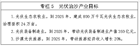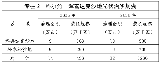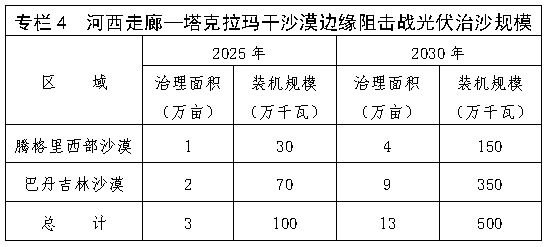 (三)推進林光互補的光伏治沙模式,助力打贏河西走廊—塔克拉瑪干沙漠邊緣阻擊戰(zhàn)。在騰格里西部沙漠、巴丹吉林沙漠及周邊,避開高大密集型沙丘和沙丘鏈,采用抗揚沙、高效率的光伏技術集中連片布置光伏項目。到2025年建成光伏裝機100萬千瓦,到2030年建成500萬千瓦。推廣種植梭梭、駝絨藜等超旱生灌木,蒙古冰草等牧草,形成種植耐旱、固土的多年生草本植物為主的防風固沙治理模式。到2025年完成治沙面積3萬畝,到2030年完成治沙面積13萬畝。