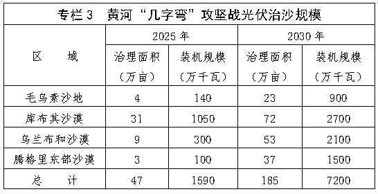 (二)推進以林光牧光相結合的光伏治沙模式,助力打贏黃河“幾字彎”攻堅戰(zhàn)。在毛烏素沙地、庫布其沙漠、烏蘭布和沙漠、騰格里東部沙漠及周邊,采用適應干旱、半干旱環(huán)境的抗沙塵、高效率光伏技術路線,統(tǒng)籌光伏開發(fā)、生態(tài)旅游、工業(yè)園區(qū)等分區(qū)域用途管理,對較集中區(qū)塊進行光伏規(guī)?;_發(fā),在沙漠、沙地邊緣居住區(qū)進行光伏分布式開發(fā)。到2025年建成光伏裝機1590萬千瓦,到2030年達到7200萬千瓦。推進種植耐旱、固土的多年生草本植物,在有條件的地區(qū)探索種養(yǎng)結合模式,實現(xiàn)林光互補和牧光互補。到2025年完成光伏治沙面積47萬畝,到2030年完成光伏治沙面積約185萬畝。