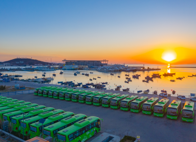 山東煙臺(tái)長島漁港碼頭附近,純電動(dòng)綠色公交車整齊排列。供電公司協(xié)助開展智能充電樁運(yùn)維工作。