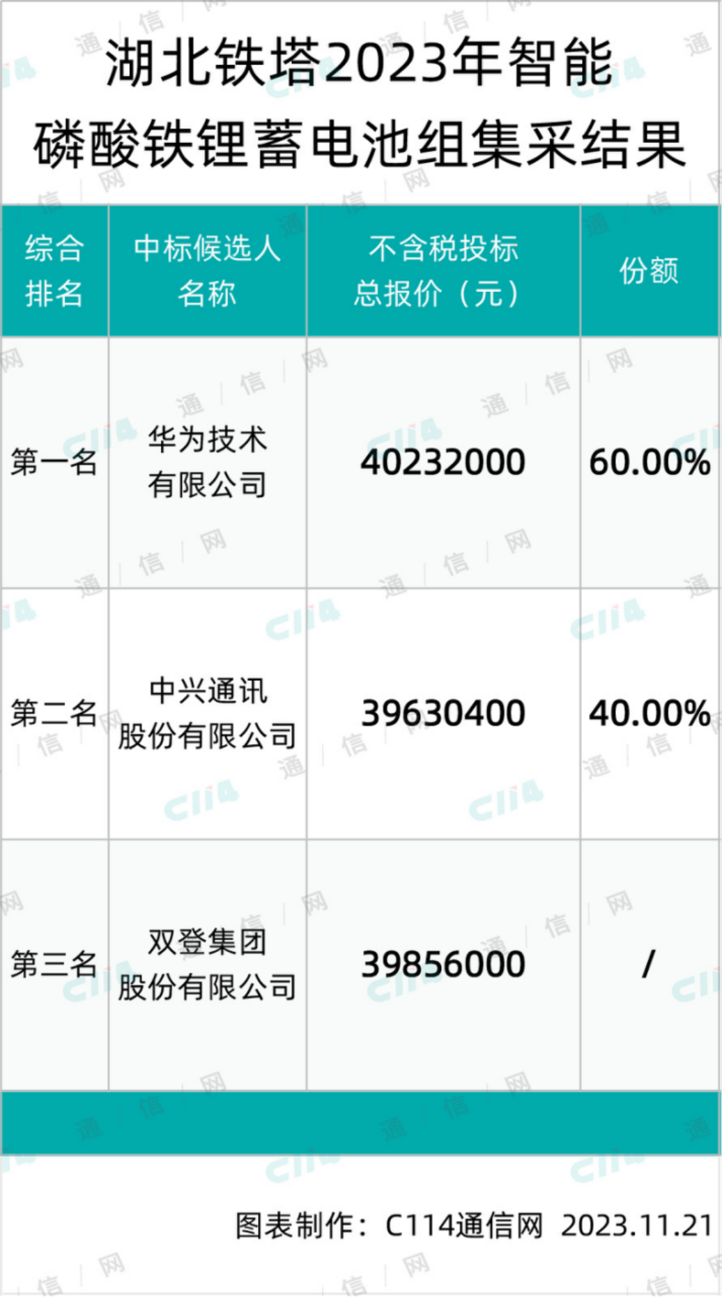 中國儲(chǔ)能網(wǎng)訊:11月21日消息(焦焦)從中國鐵塔官網(wǎng)獲悉,湖北鐵塔今日公示了2023年智能磷酸鐵鋰蓄電池組的集采結(jié)果,華為、中興兩家中標(biāo)。