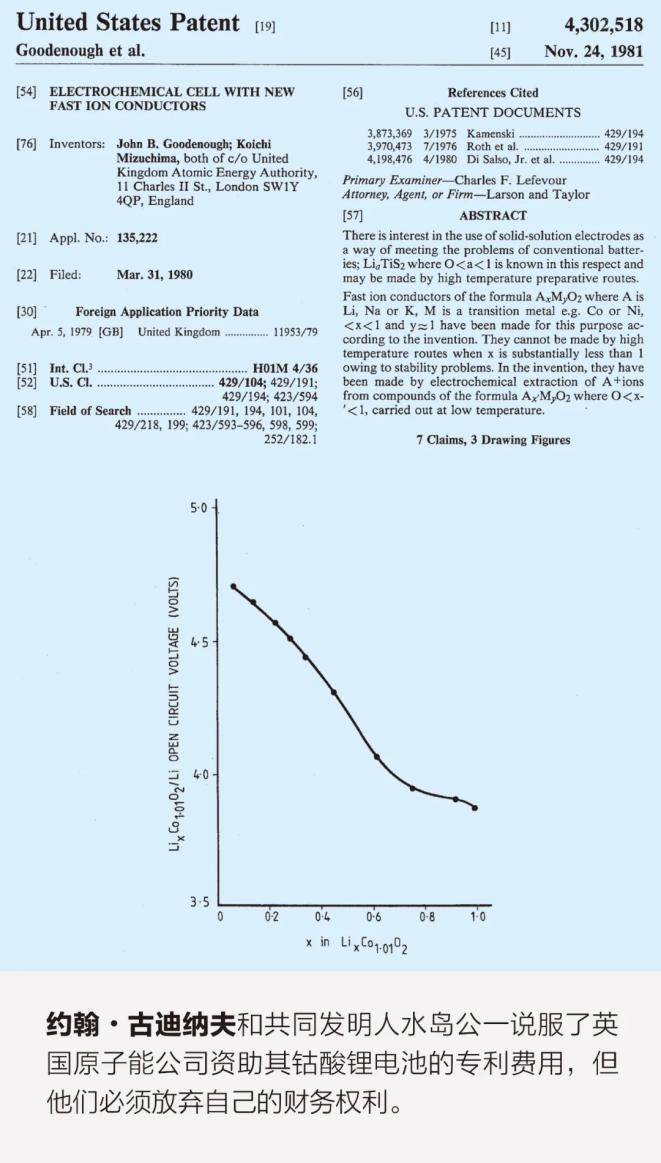 盡管如此,古迪納夫?qū)ψ约旱碾姵鼗瘜W(xué)技術(shù)仍然信心十足。他參觀了英國(guó)原子能研究所(AERE),這是一家政府實(shí)驗(yàn)室,位于距牛津大學(xué)約20公里的哈維爾。該實(shí)驗(yàn)室同意為其專利提供資金,前提是這位59歲的科學(xué)家和他的共同發(fā)明人水島簽署協(xié)議,放棄其財(cái)務(wù)權(quán)利。兩人同意了這一條件。實(shí)驗(yàn)室于1981年獲得專利;古迪納夫從未得到過(guò)有關(guān)原始電池的任何收益。