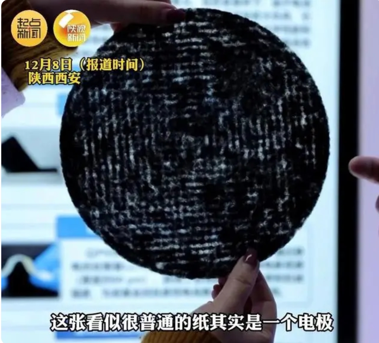 這張看似很普通的紙其實是一個電極,它是由碳納米管和普通紙張里所富含的纖維素通過造紙工藝制作而成的。如果將這兩張含有正負電極材料的紙進行物理耦合,就會形成一個完整的柔性電池。