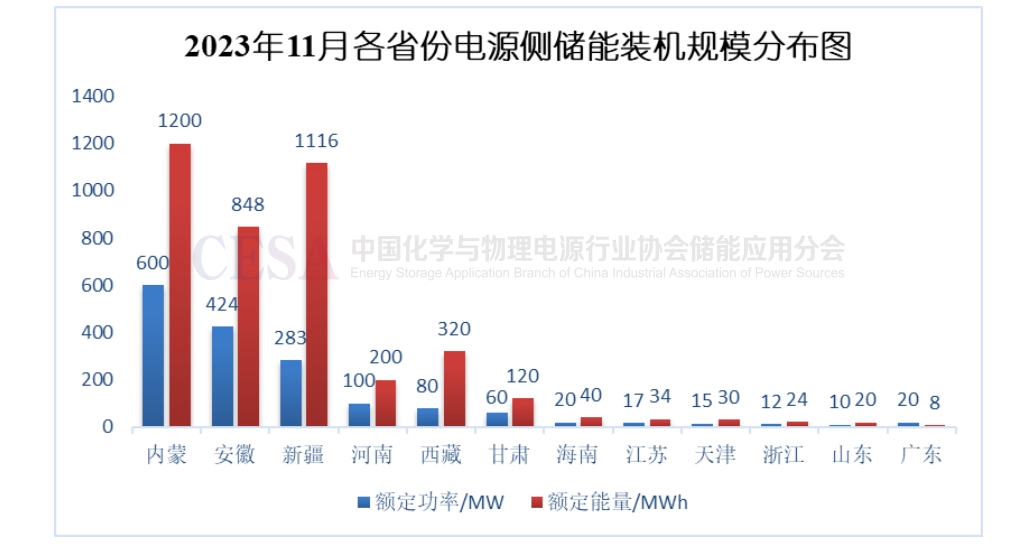 圖2-1-2 2023年11月各省份電源側(cè)新型儲能裝機(jī)規(guī)模分布圖