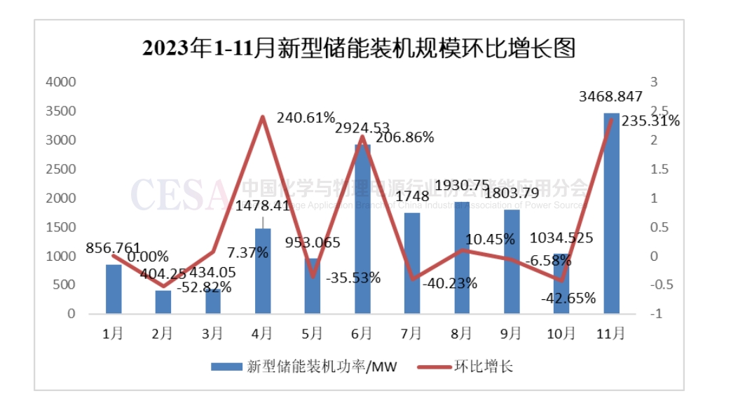 圖1 2023年1-11月新型儲能裝機(jī)規(guī)模環(huán)比增長圖