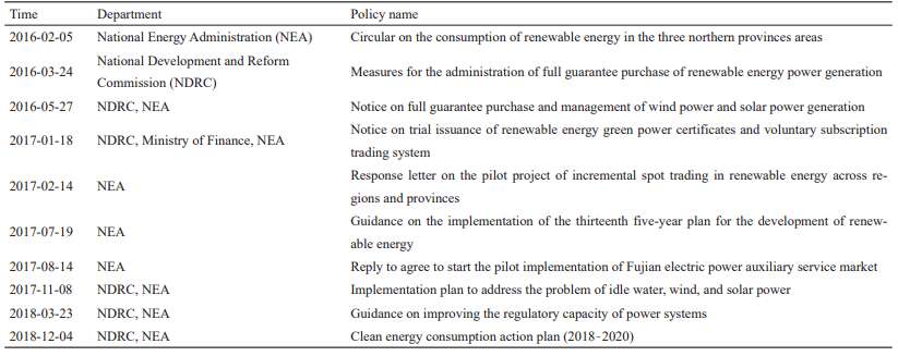 電力市場的發(fā)展必然要求對電廠的發(fā)電量進行市場競價。因此,火力發(fā)電的靈活性、低碳含量和可再生能源的可持續(xù)性應成為市場競價的主要考慮因素。轉(zhuǎn)變能源結構,引導火力發(fā)電企業(yè)提高經(jīng)營靈活性,促進可再生能源的大規(guī)模消費,是中國能源發(fā)展的必由之路。因此,迫切需要市場機制,如輔助服務市場政策以增強各類供電的靈活性。2012年,英國政府首次提出了海上風力發(fā)電場成本降低政策,以此降低由化石燃料產(chǎn)生的溫室氣體排放,這一政策已被其他國家效仿。中國政府強調(diào)以清潔技術為基礎的能源政策,不斷推動能源革命和治理污染。2016—2018年旨在擴大可再生能源消納的政策如表5所示。